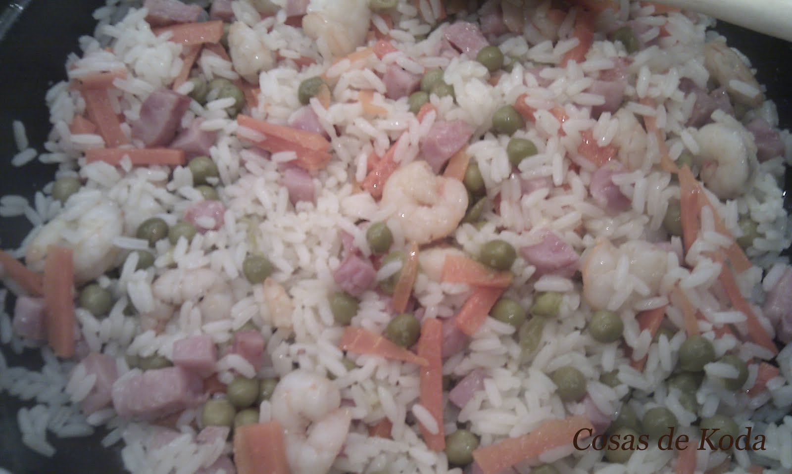 Lo primero de todo es poner el arroz a cocer. No hay que preocuparse por las medidas, simplemente hacerlo en abundante agua con un poco de sal. Depende del arroz, pero dos minutos menos de lo que marca el envase para que quede un poquitín duro, lo justo para que se acabe de hacer con el calor de la sartén.